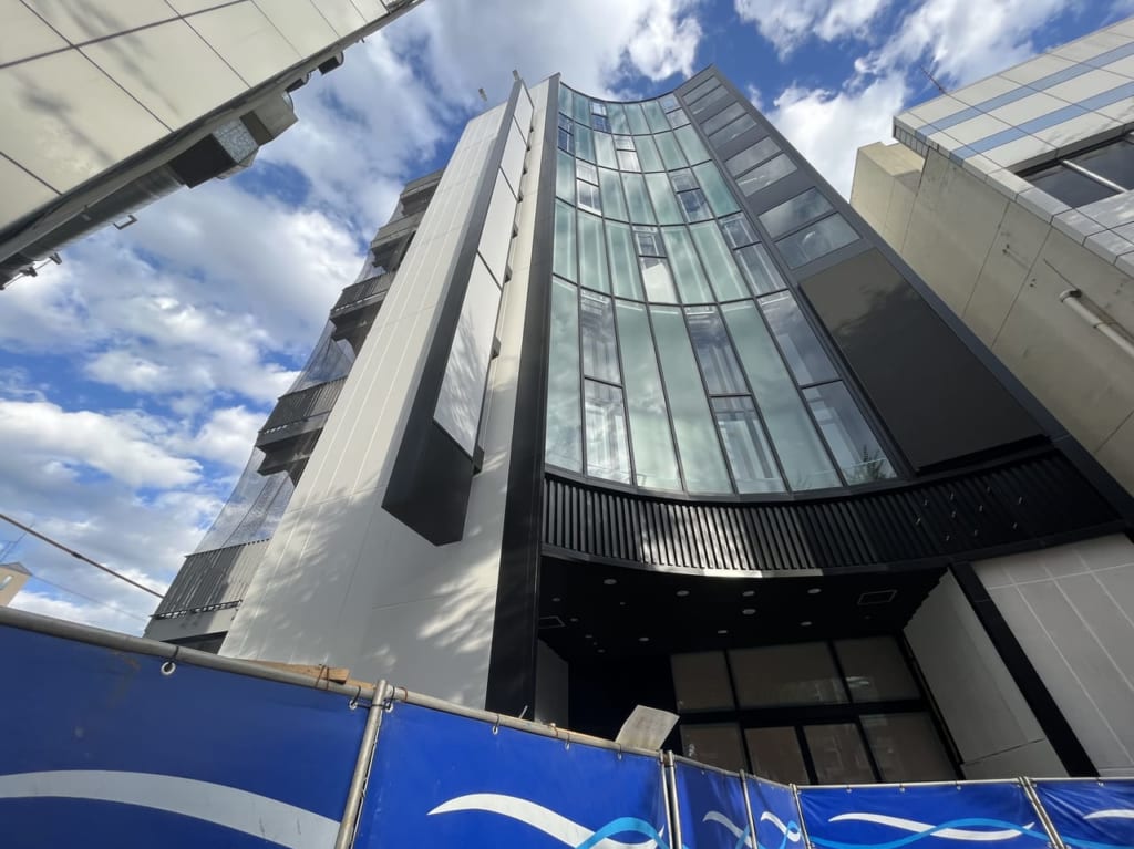 以前、建設中の建物として記事にしました。ブルーの工事用シートが覆っていた外観も完成していました。