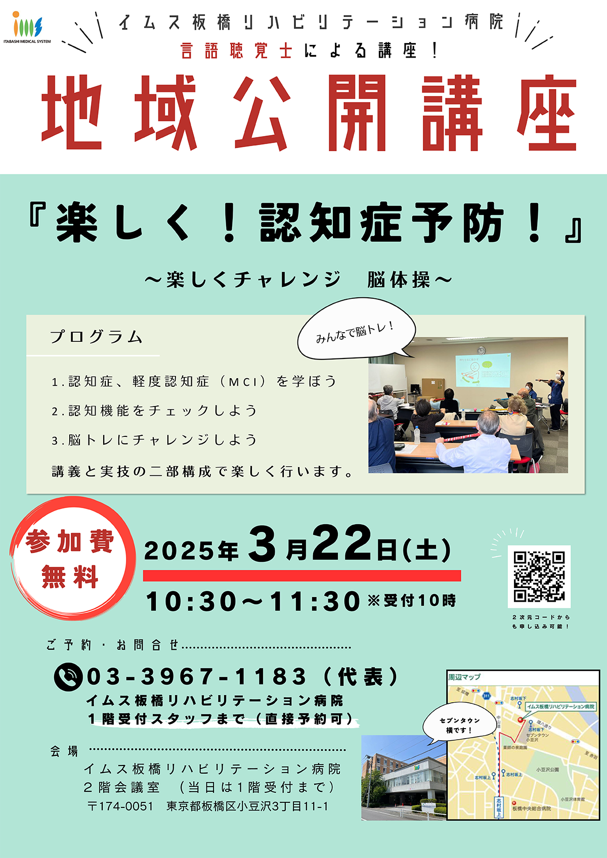【板橋区】参加無料!3月22日イムス板橋リハビリテーション病院で認知症予防に役立つ!地域公開講座を開催