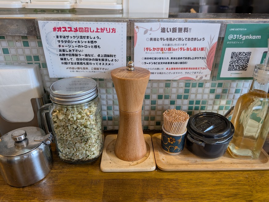 テーブルには珍しい青のり風味の揚げ玉や、自家製の食べるラー油、まぜそばにかかせないお酢やすりおろしにんにくが置かれ、味変を楽しめるのもポイントです!