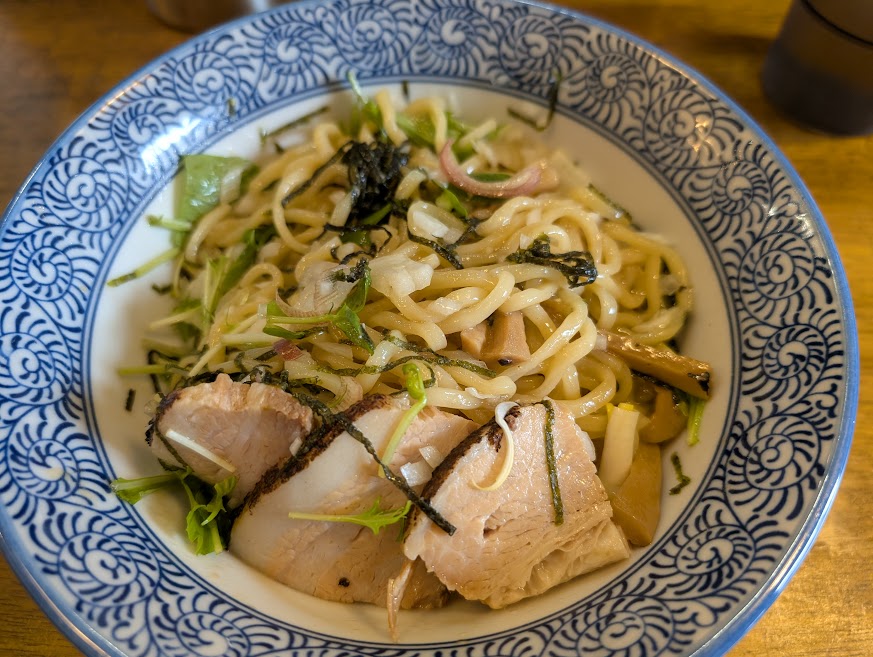 今回注文したのは「まぜそばジャック」(950円)。炙りチャーシューたっぷり!玉ねぎやメンマ、野菜、海苔が絶妙なバランスです!もちもちの太麺に、節系の旨味が効いた醤油ダレが絡み、幅広い世代に愛されそうな優しい味わい。