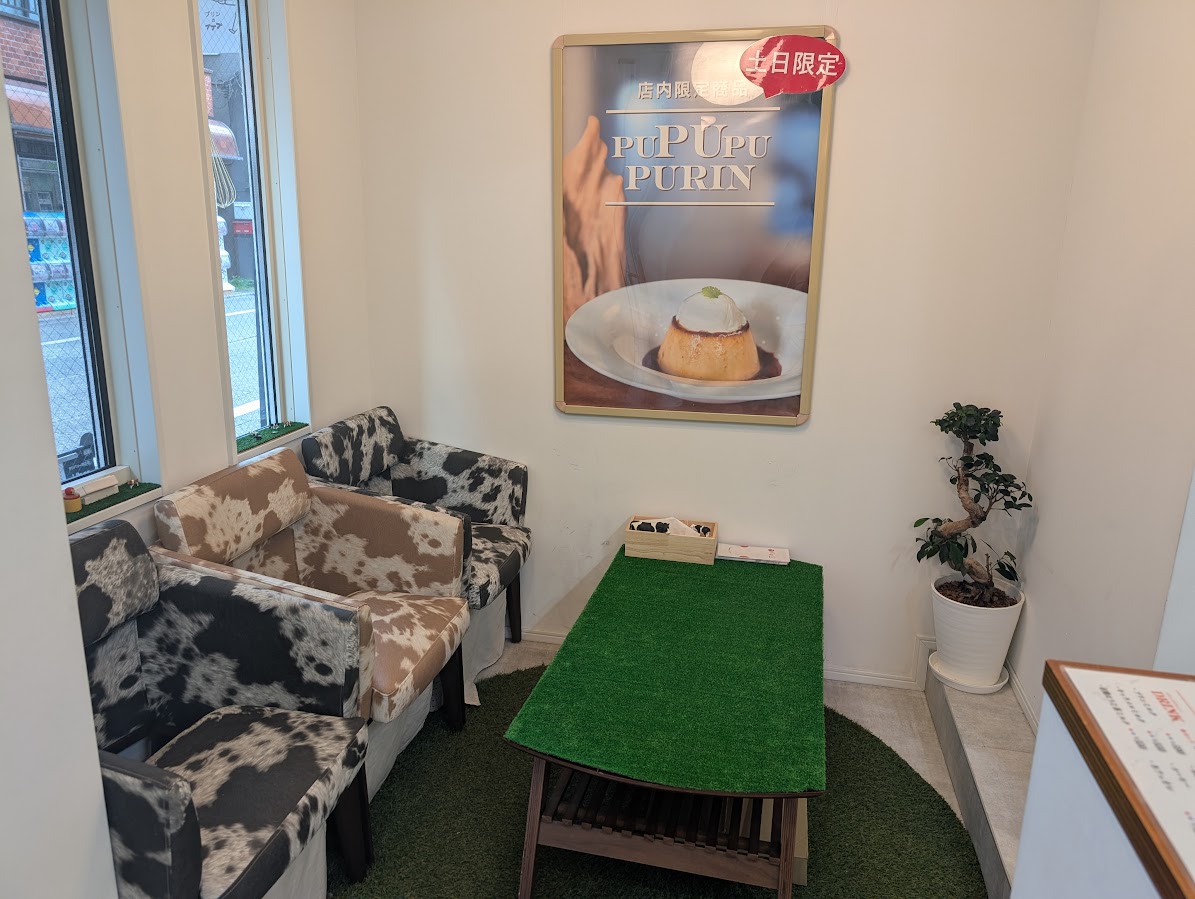 店内入って左手には牛柄模様の椅子と、テーブルが芝になっており、牧場をイメージするような空間がとてもおしゃれ!