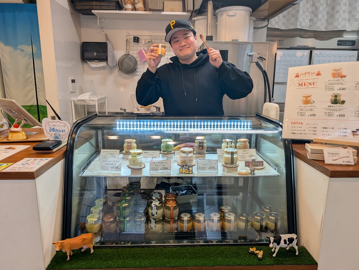 「プリンのプププ」の店長・あきとさんは大阪出身でとても気さくな方。人情味あふれる大山の雰囲気が大阪の雰囲気と似ており、地域を愛されています♪使用する卵や牛乳は、信頼できるメーカーさんから仕入れており、安心・安全で美味しいプリンを提供するための強いこだわりが感じられます。