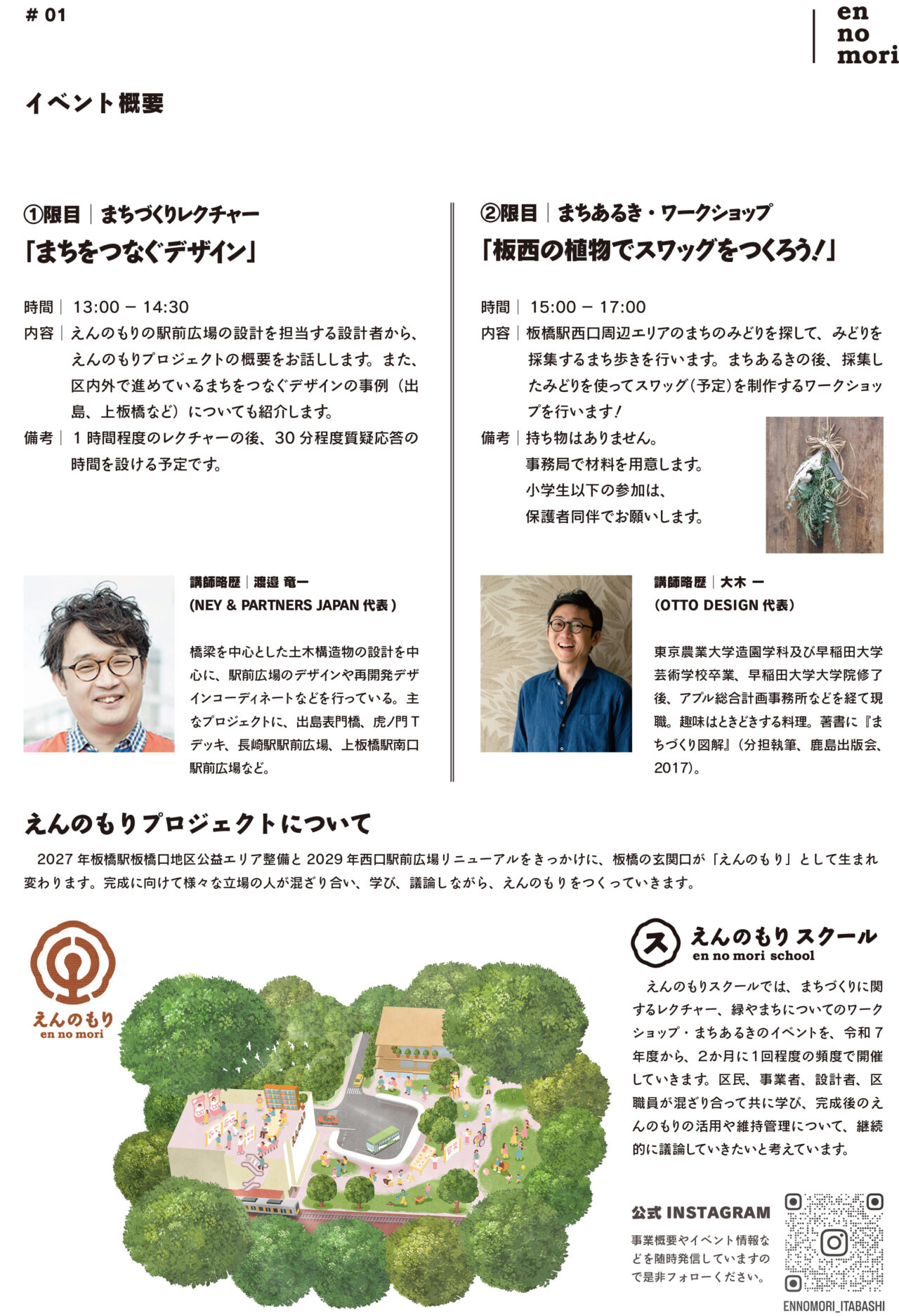 第一部は「まちをつなぐデザイン」と題したまちづくりレクチャー。えんのもり駅前広場の設計を手がける渡邉竜一氏(NEY & PARTNERS JAPAN代表)が登壇し、板橋区や全国で進むまちづくりの事例を交えながら、未来のまちのあり方を語ります。質疑応答の時間もあり、直接質問できる貴重な機会です。
