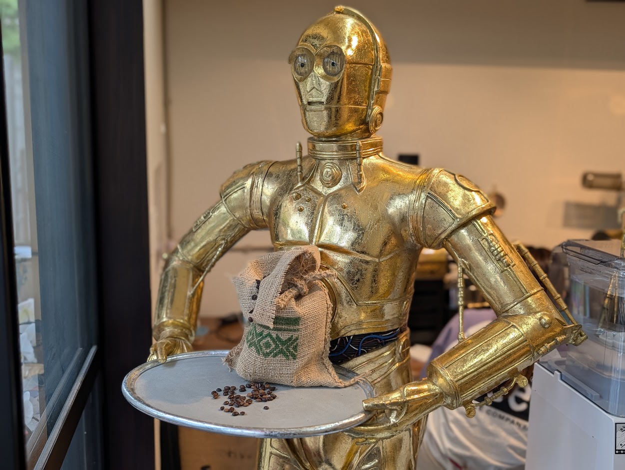 お店の前を通ると、思わず深呼吸したくなるようなコーヒー豆の焙煎の香ばしい香りがふわっと漂ってきます。店内に足を踏み入れると、そこには驚きの世界が!なんと、スターウォーズの人気キャラクター「C-3PO」が来店者を出迎えてくれます。