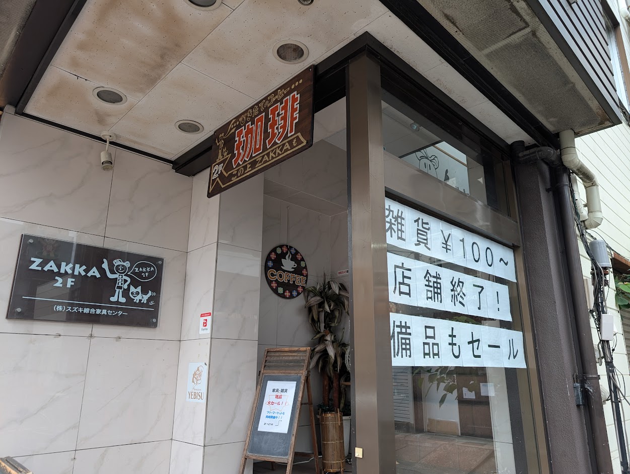 2025年5月でカフェ営業終了、7月末で完全閉店とのこと。現在は現品大処分セールを開催中。雑貨は100円から購入可能で、店内備品もセール対象になっています。