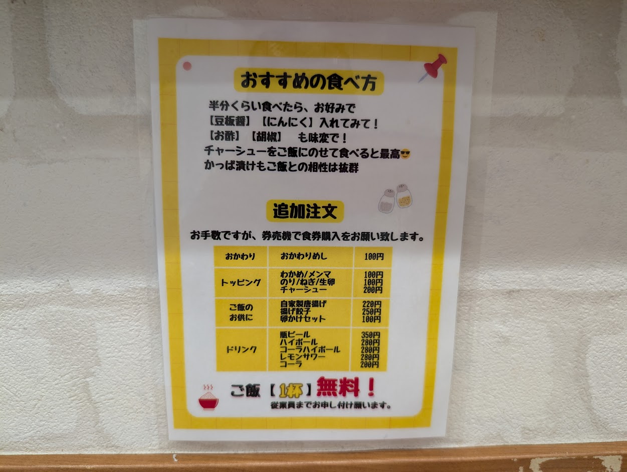 おすすめの食べ方の掲載もありました!途中で半分くらい食べたタイミングで、「豆板醤」「にんにく」をいれるのがおすすめ!「お酢」「胡椒」をいれて味変を楽しんでみるのもおすすめ!