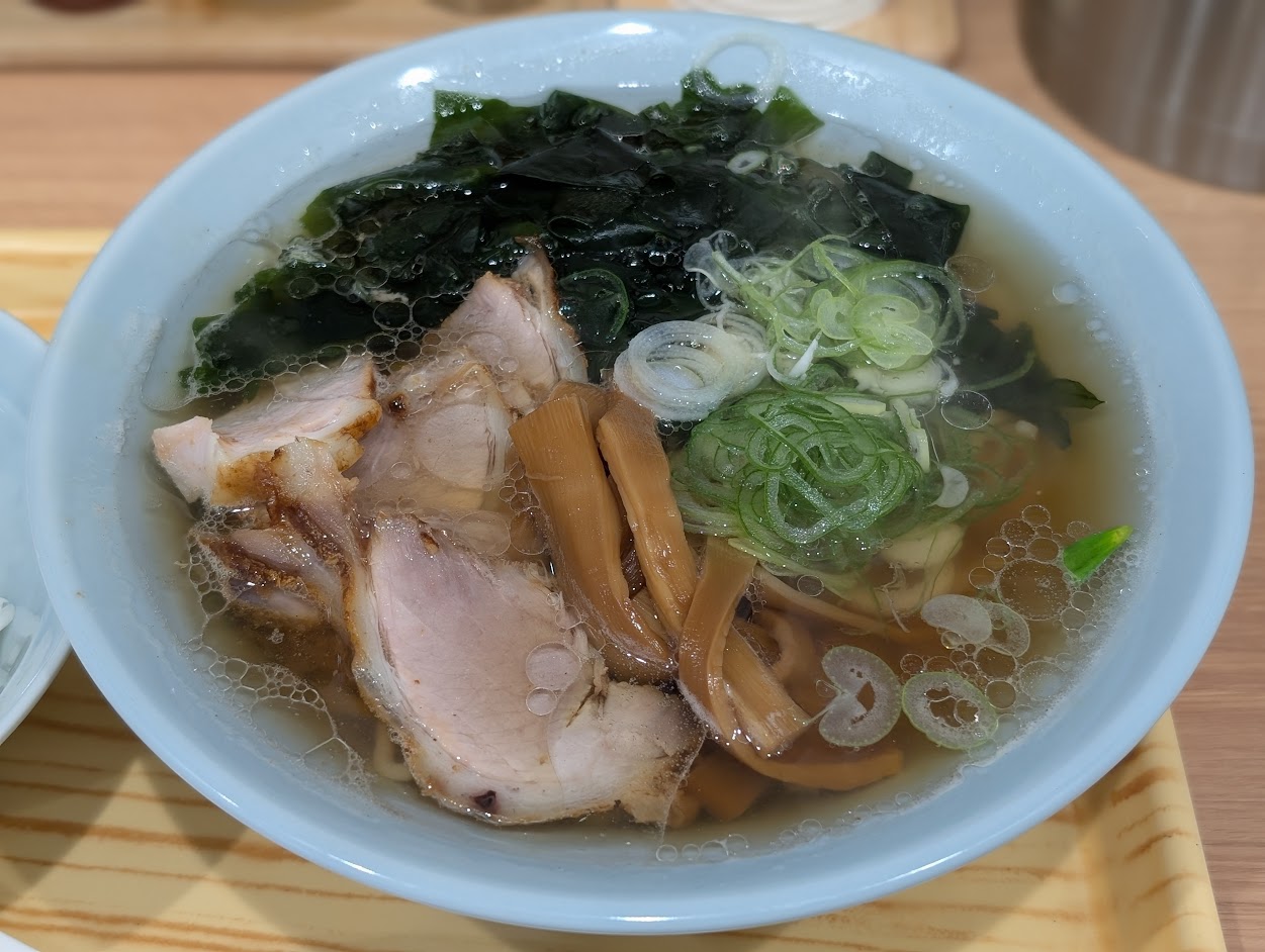 この日、「中華そば」(850円)にわかめトッピングを追加し注文!”めし”が無料なので、小サイズを頼みました。
