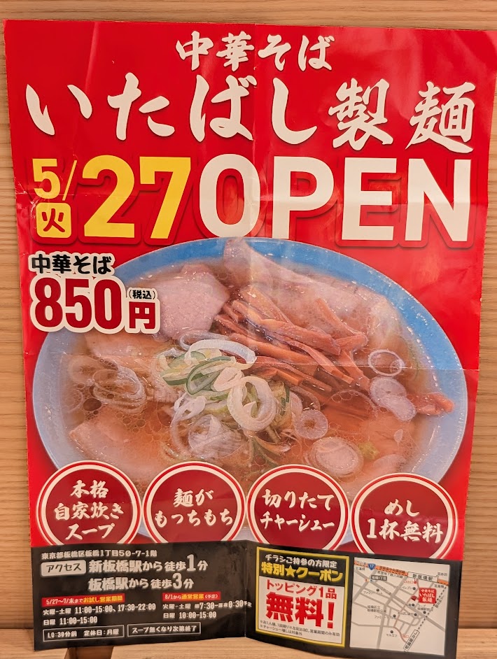 【板橋区】新板橋に「中華そば いたばし製麺」が5月27日オープン!自家炊きスープ&もちもち麺が自慢!
