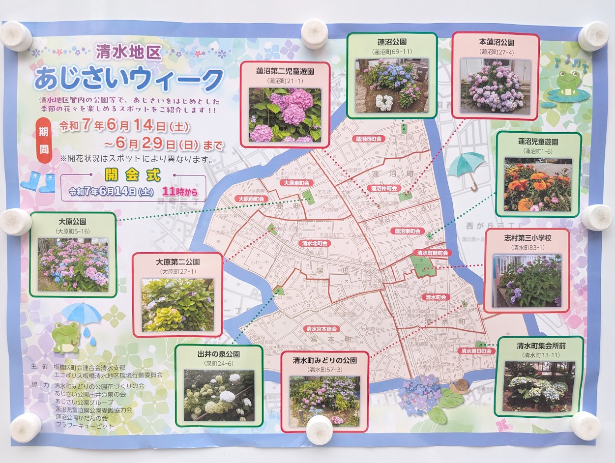 毎年恒例となっている「清水地区あじさいウィーク」が、2025年も板橋区内で開催されます。開催期間は2025年6月14日(土)から6月29日(日)まで。この時期、地域のあちこちで見ごろを迎える美しい紫陽花(あじさい)を楽しめる人気のイベントです。