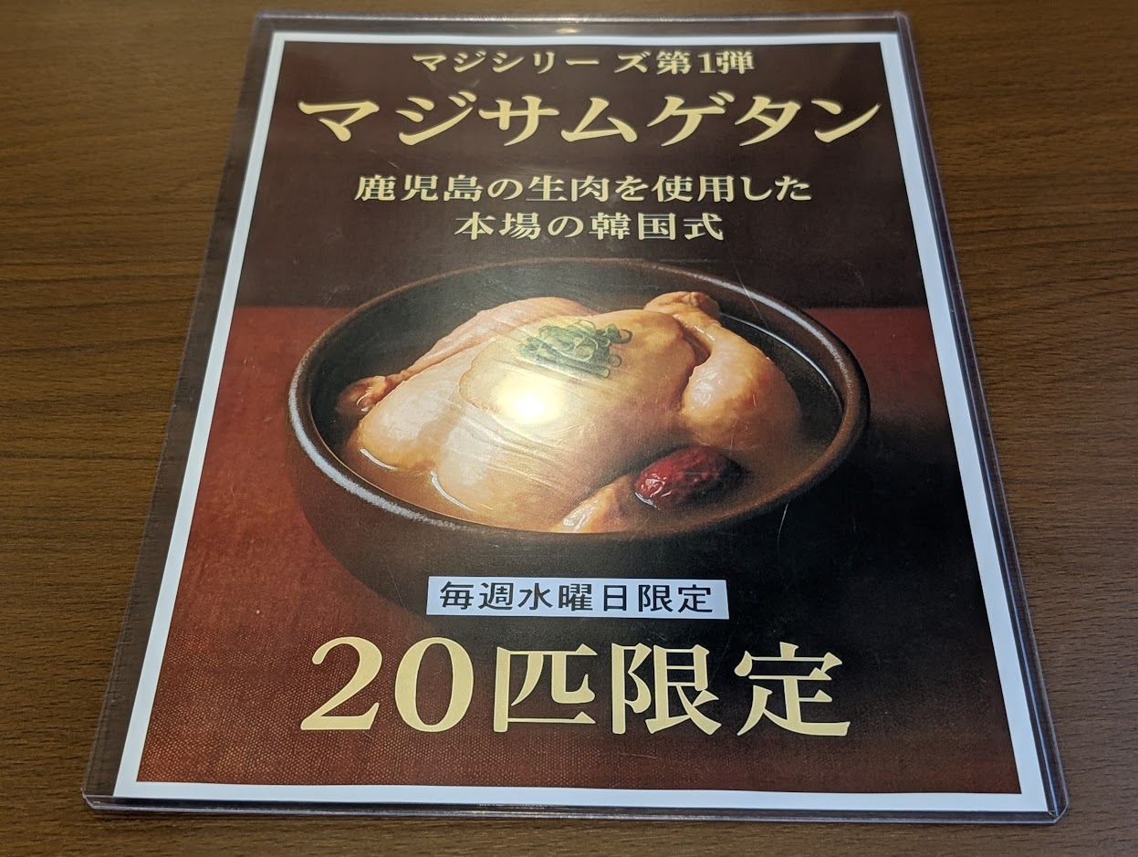 お店の方におすすめのメニューをお聞きしたところ、マジシリーズ第1弾の水曜・20匹限定の「マジサムゲタン」とのこと。