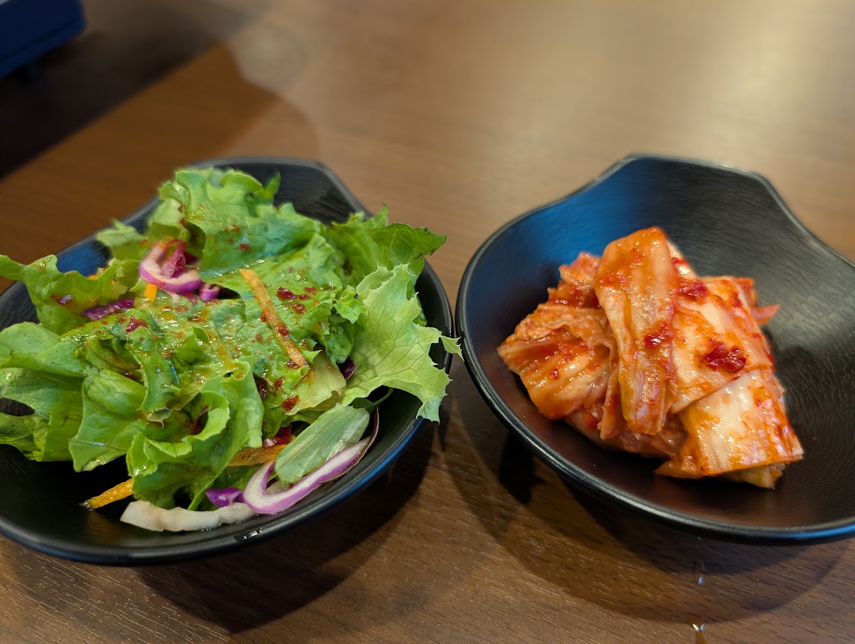 手作りドレッシングがかかったサラダとキムチもついており、嬉しいですね!