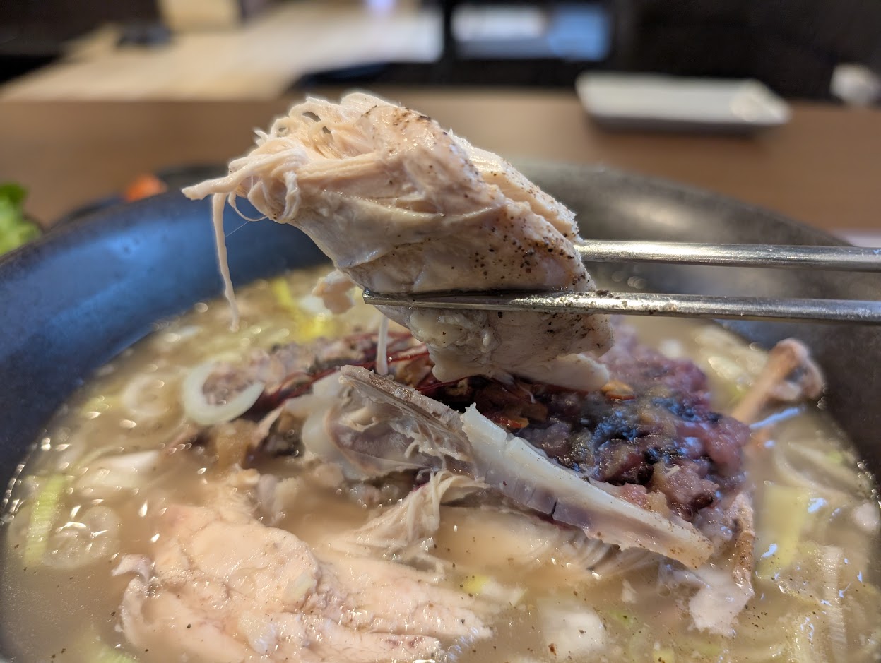 本場韓国式で輸入の冷凍の鶏ではなく、鹿児島県産の生肉の丸鶏を使用し、穀米・もち米・にんにく・高麗人参・なつめなどを加えて3~4時間じっくり煮込んだ一品。鶏の足(もみじ)も加え、スープはとろとろの濃厚な仕上がりです。