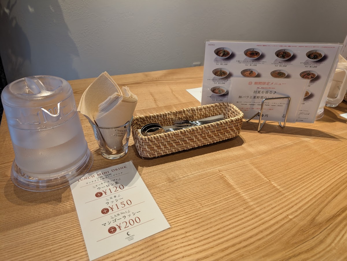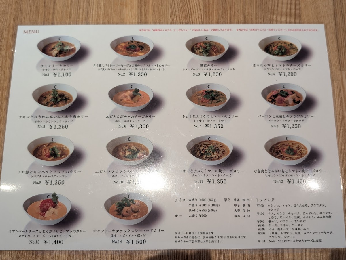 カレーのメニューは、神田本店とほぼ同じ構成で、ココナッツミルクをベースにした個性的なカレーが揃っています。