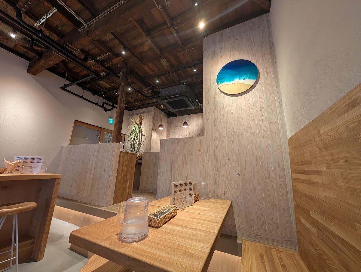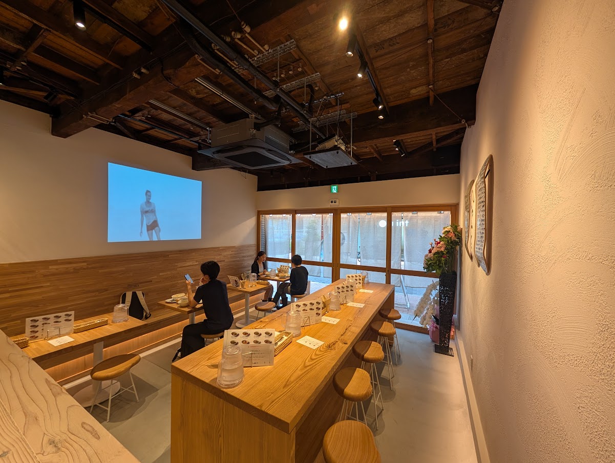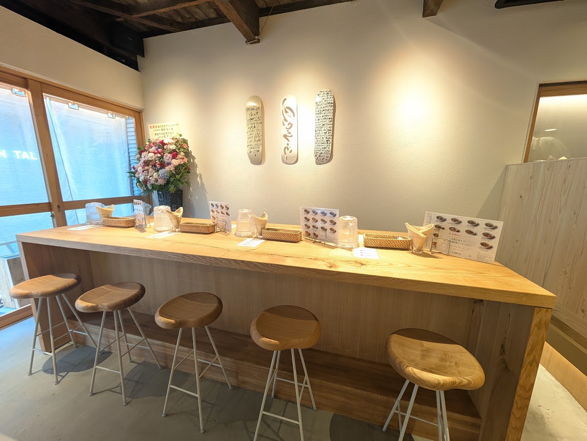 店内は、ナチュラルな雰囲気で統一されており、特注のイスやスケートボードが飾られた壁面。